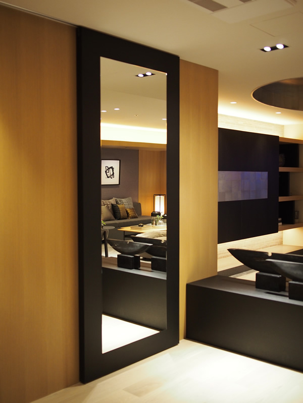 天井高いっぱいまで伸びる扉により、壁との一体感が生まれスッキリとした空間に。 さらに鏡の効果で奥行きを見せることで、気持ちの良い解放感をお部屋につくりあげます。